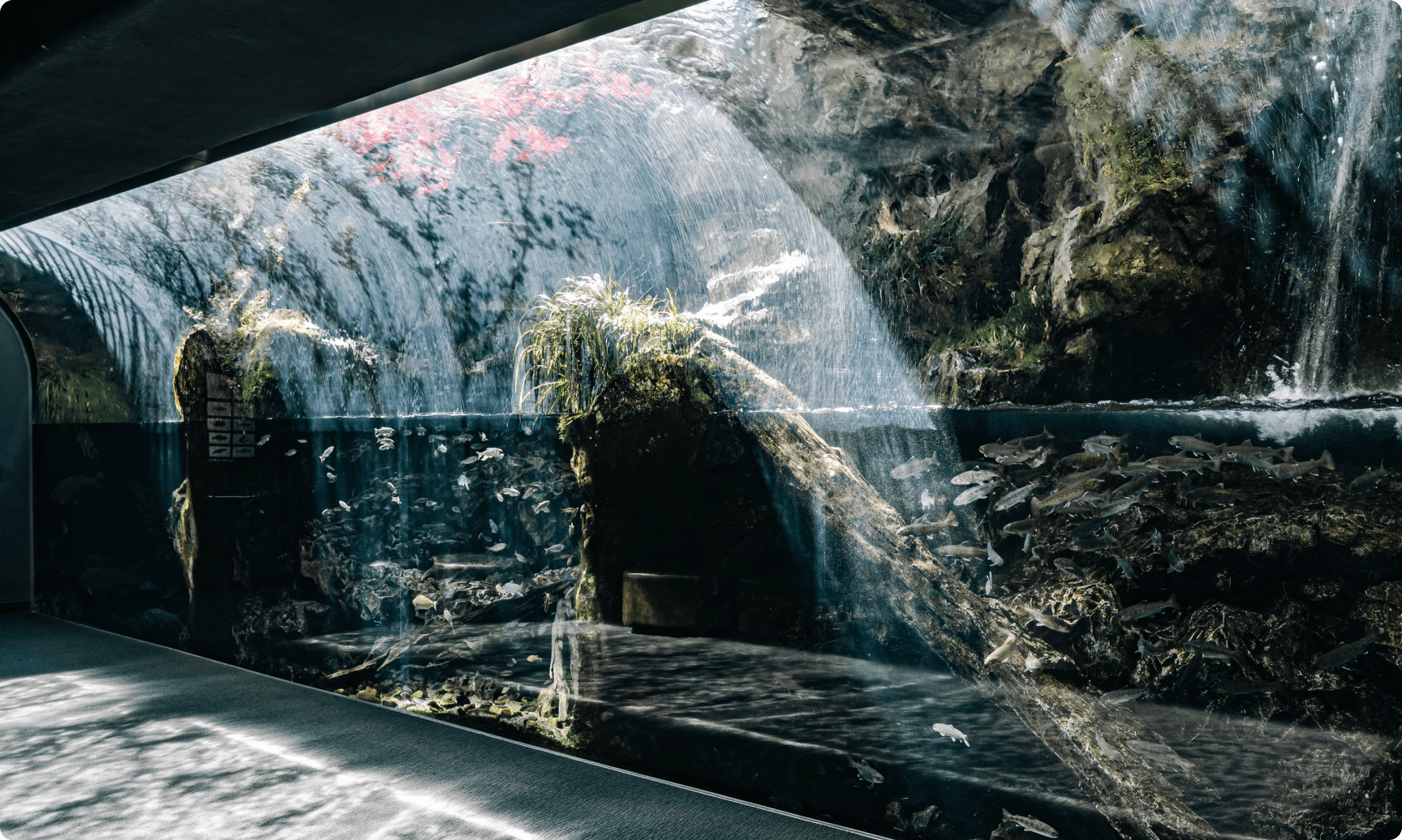 由良川の上流・中流・下流をひとつの水槽で表現しました。上流ではイワナやヤマメ、中流ではムギツクやオイカワ、下流ではコイなどが泳ぎます。由良川にすむいきものと四季の移り変わりをお楽しみください。