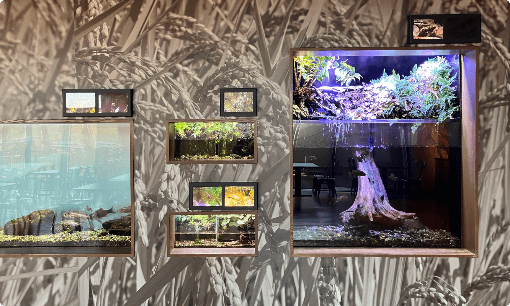 ニホンウナギやメダカの仲間など、私たちがよく知っていて身近に感じているいきものも、実は数が減少しています。山紫水明エリアではこうしたいきもののすむ環境を考えるきっかけや発見がたくさん。ぜひじっくりと、一つ一つの水槽を観察してみてください。