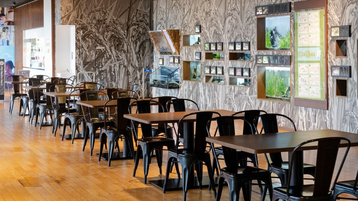 京都水族館には、3つのカフェがあります。イルカプログラムやいきものたちを見ながら、休憩しながら、お好きな飲み物や軽食をお楽しみいただけます。