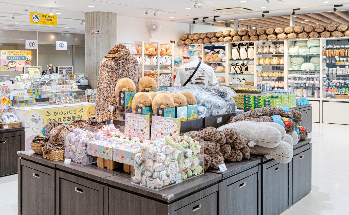 オオサンショウウオのぬいぐるみや、京都の老舗ブランドと共同開発したおみやげなど、ここでしか買えない商品をたくさん取りそろえています。
