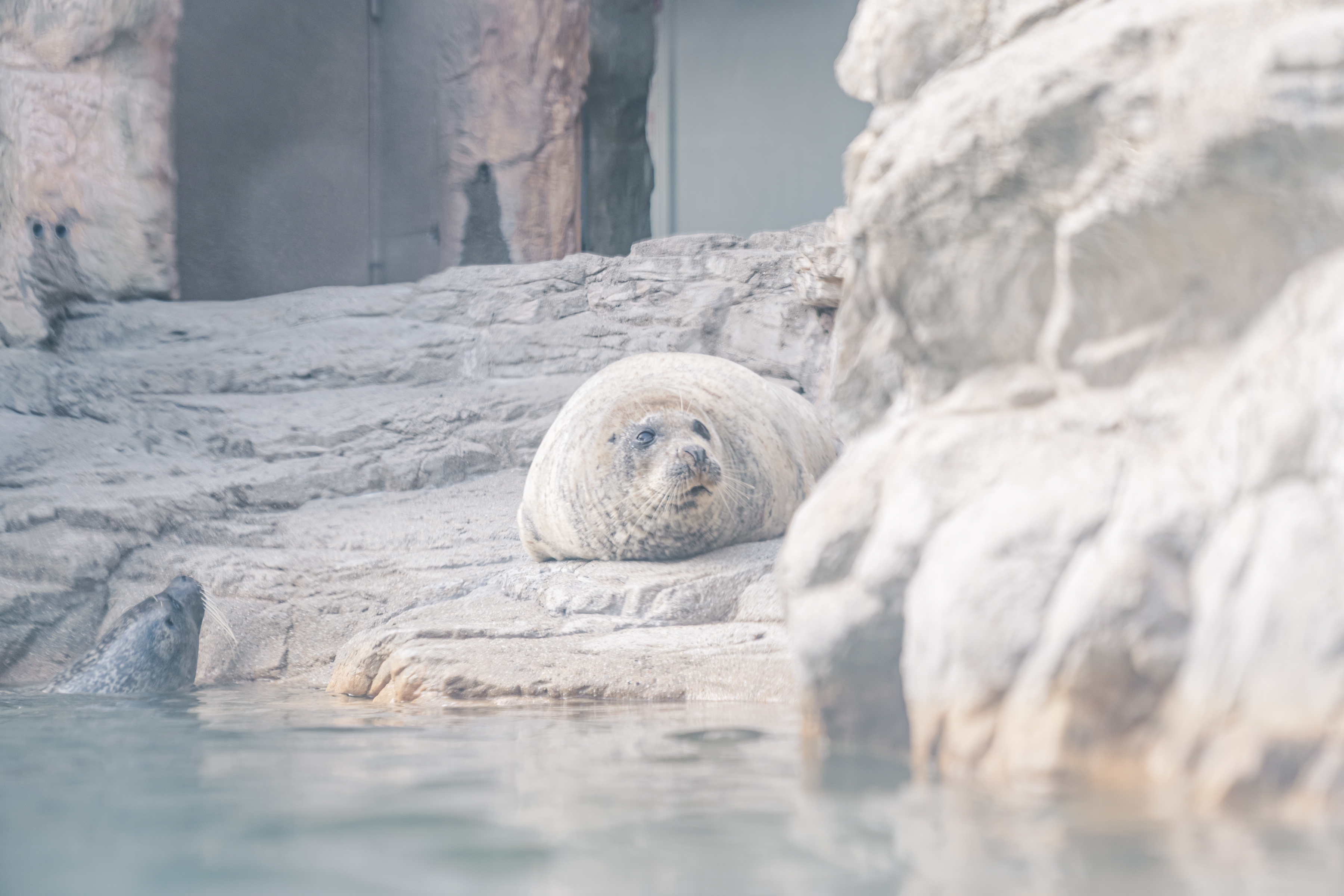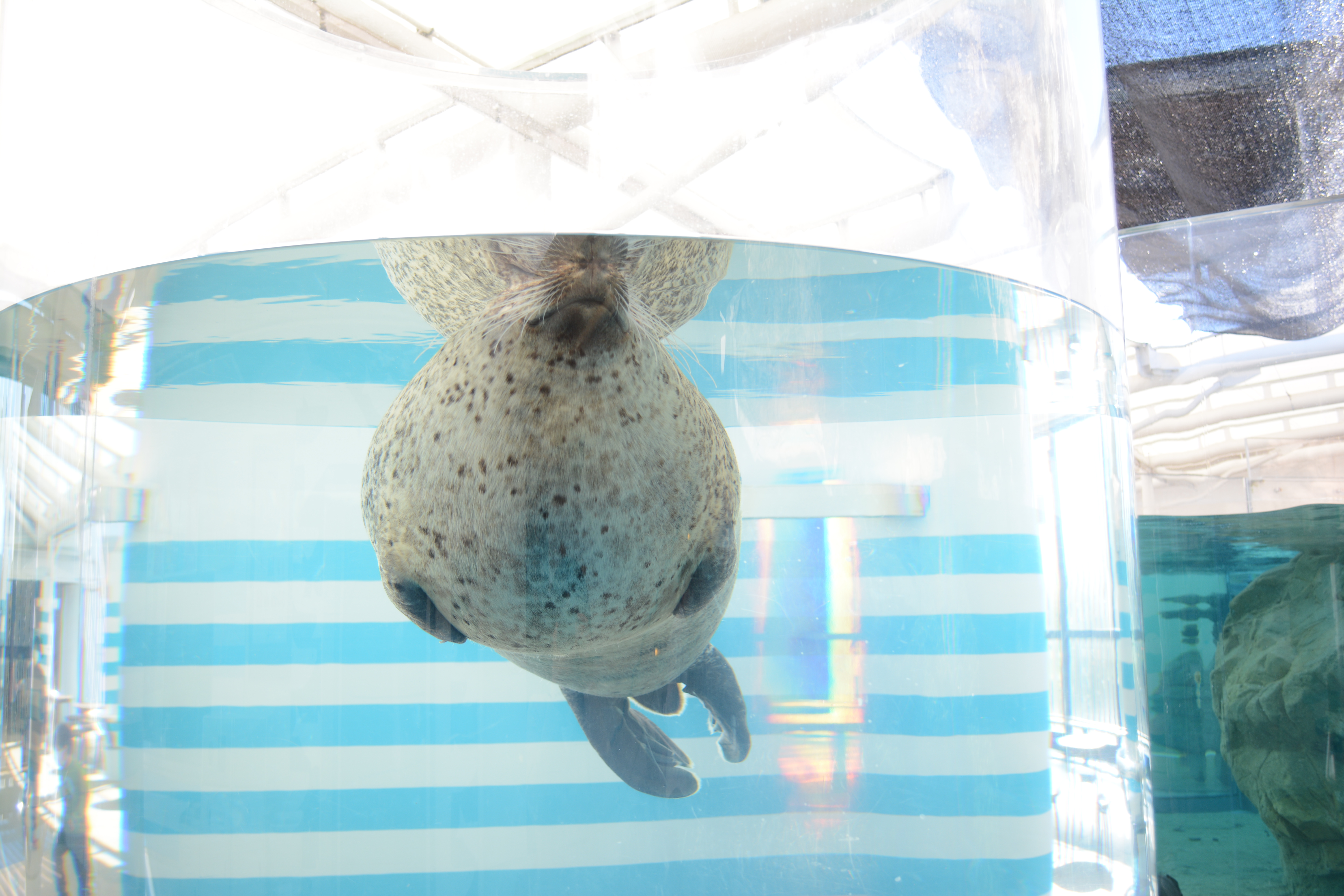 年に一度約1ヵ月半かけて全身の毛が生え変わる換毛を迎える。京都水族館では、アザラシが野生下で流氷の隙間から顔を出す習性をヒントにしたチューブ状の水槽があり、間近でアザラシたちを観察することができる。