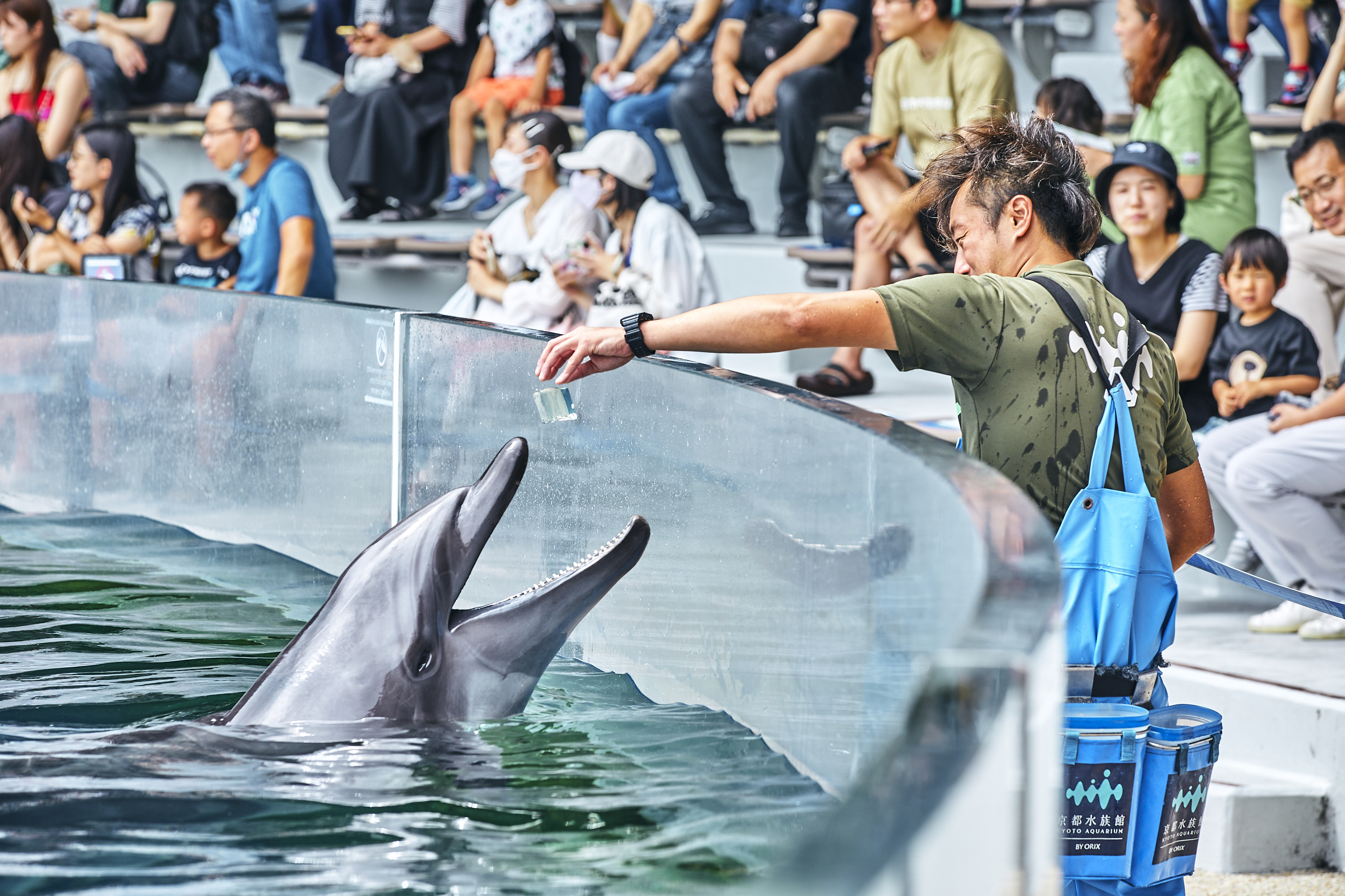体長3.4~3.9m、体重150~200kgになるいきもの。京都水族館では、イルカプログラムを通して、イルカと飼育スタッフのコミュニケーションのようすを見ることが出来る。