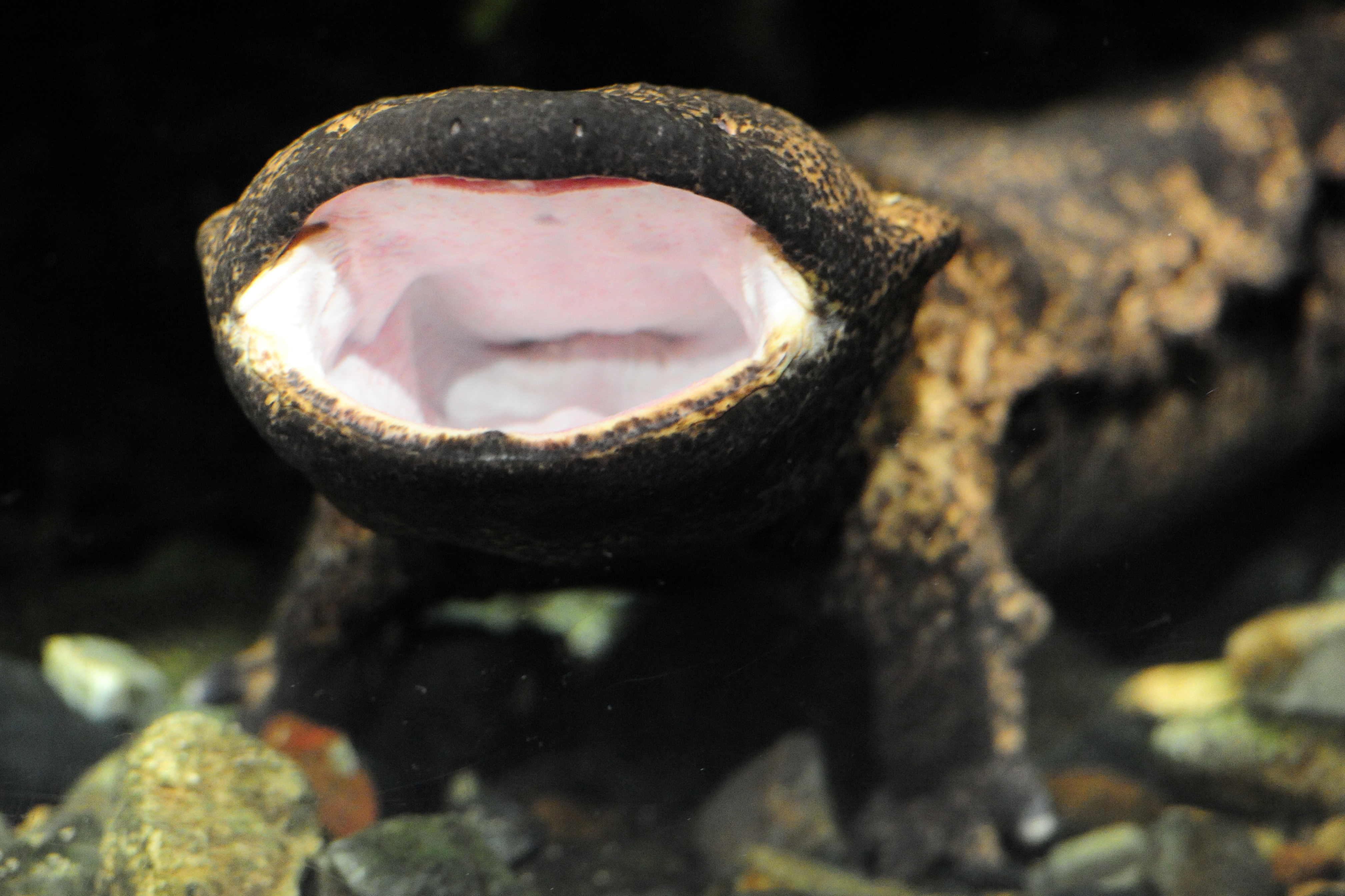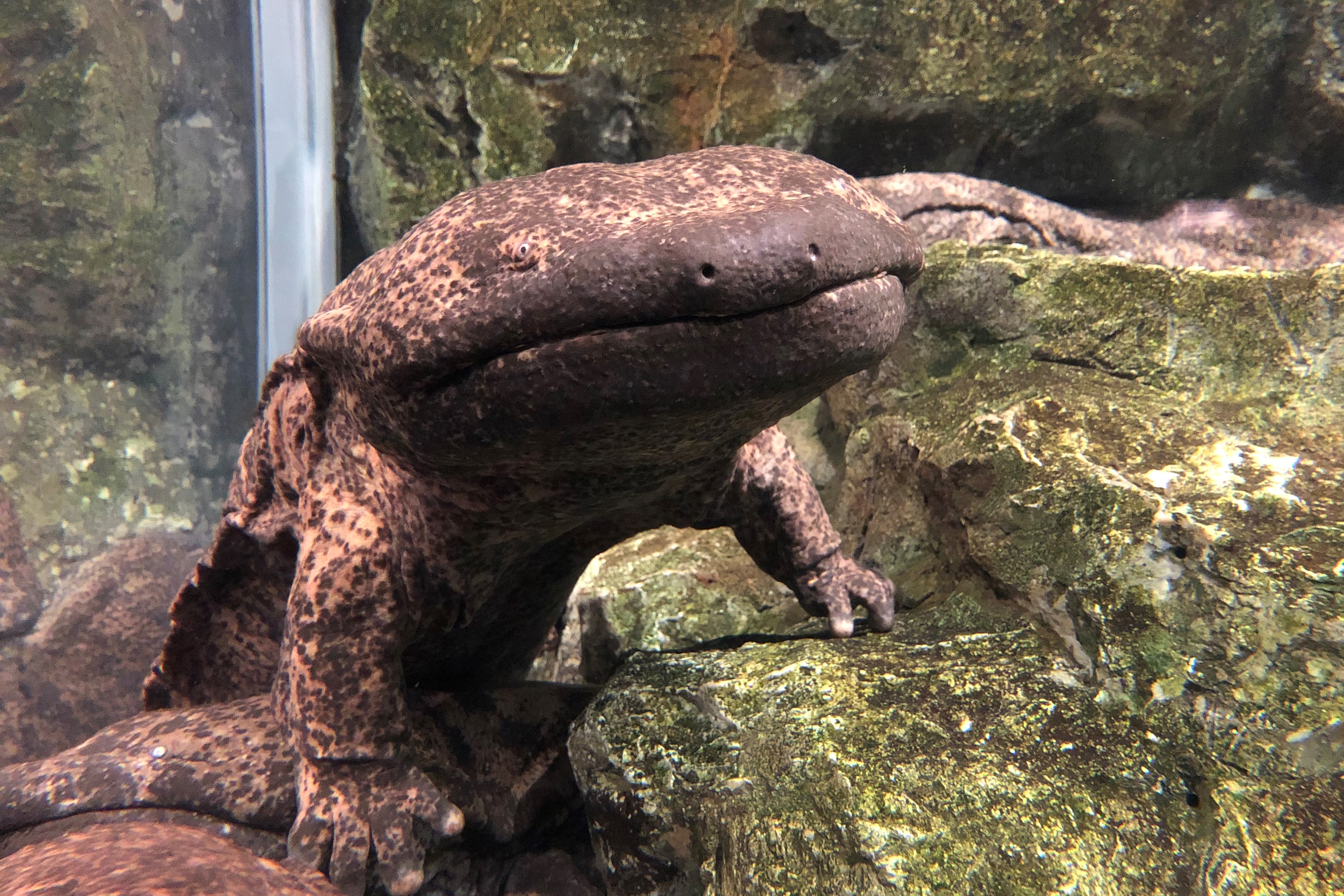世界最大級の両生類。京都水族館では、古くから日本に生息している在来種、中国からの輸入によって国内に定着したチュウゴクオオサンショウウオ(外来種)、在来種と外来種の繁殖によって生まれた交雑個体の3種類のオオサンショウウオを展示。
