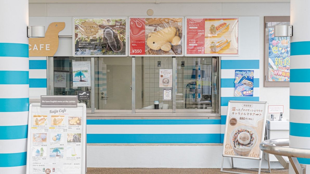 アザラシ、オットセイをみながらワンハンドで楽しめる軽食やいきものモチーフのデザート、ドリンクを販売しています。