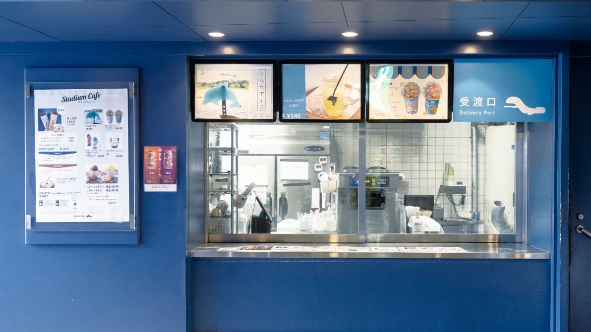 京都水族館には、3つのカフェがあります。イルカプログラムやいきものたちを見ながら、休憩しながら、お好きな飲み物や軽食をお楽しみいただけます。