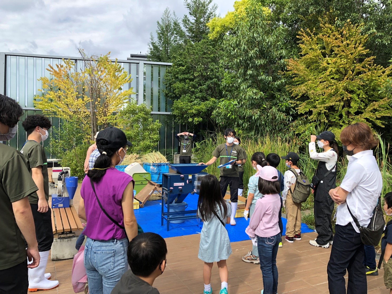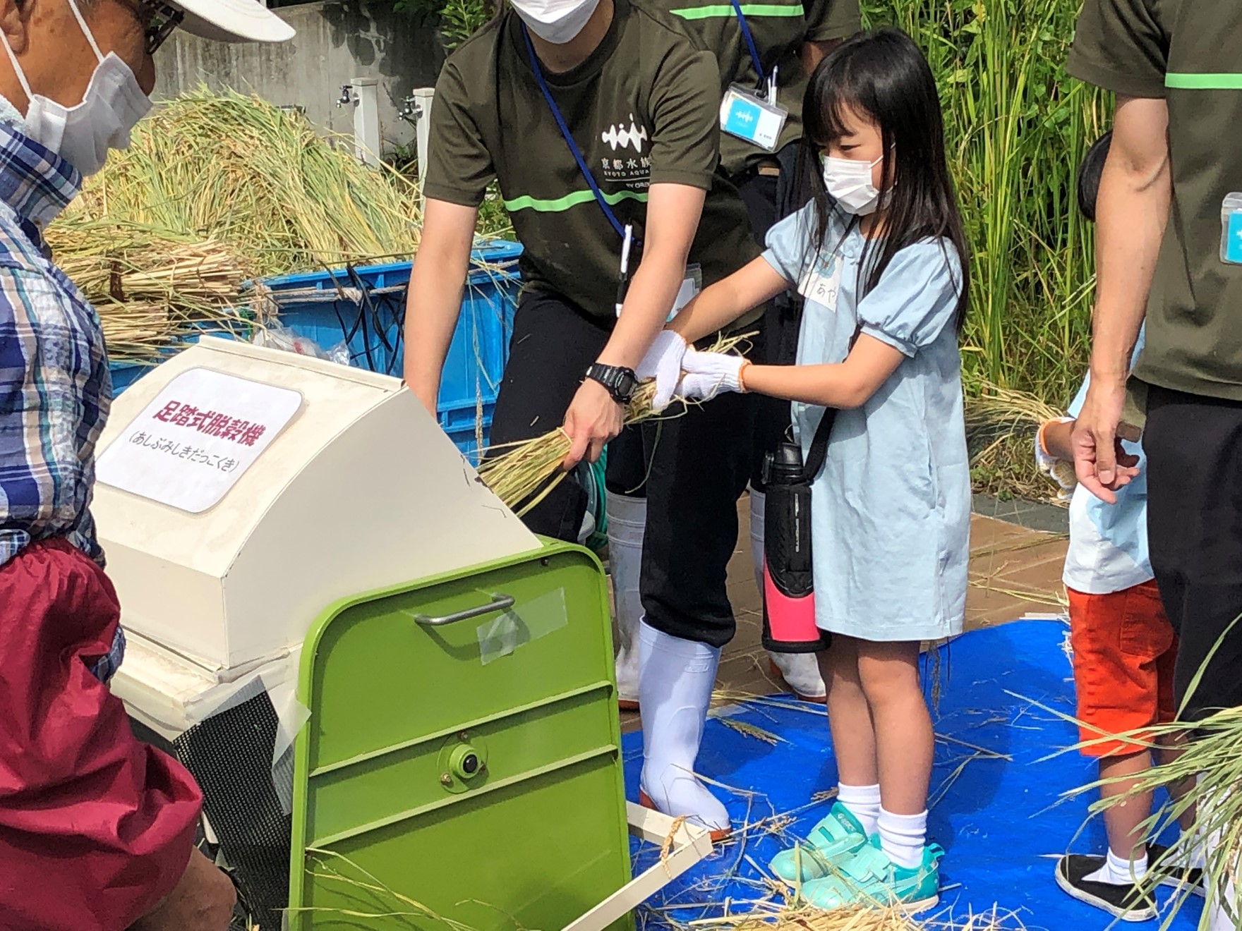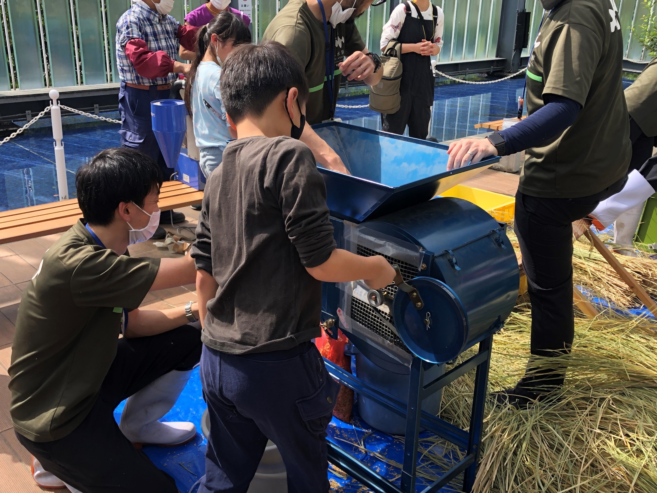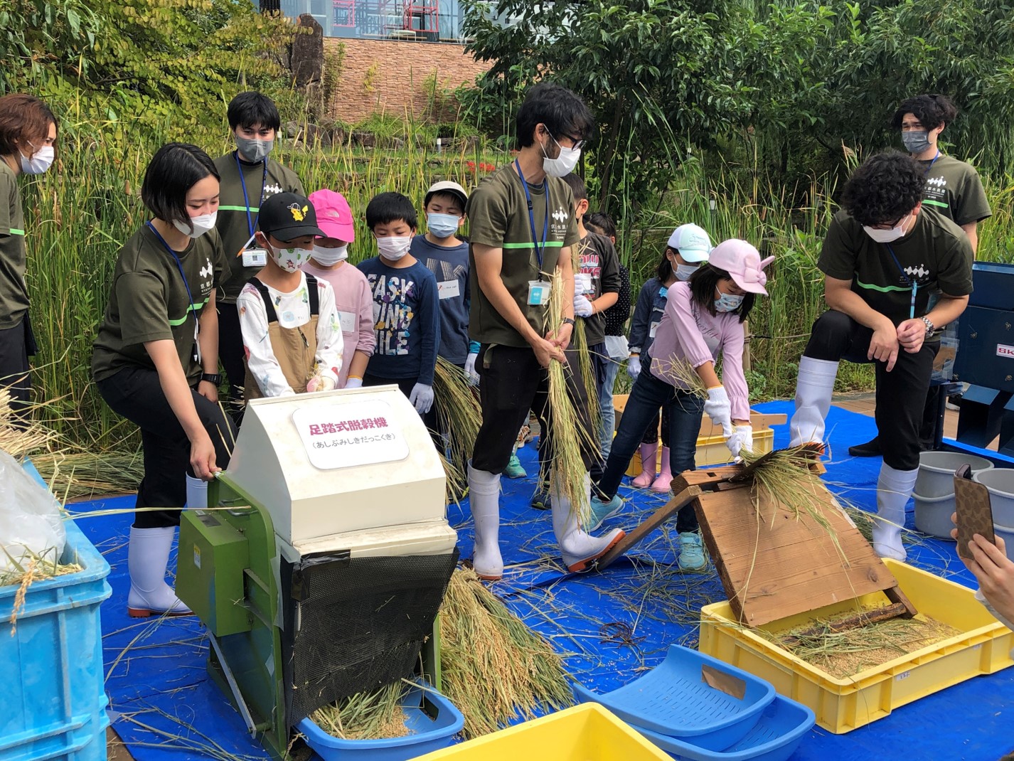 2022年9月24日(土)に、事前抽選に当選した年間パスポート会員の子どもたち11名が、里山エリアで収穫したお米の脱穀と精米作業を体験しました。