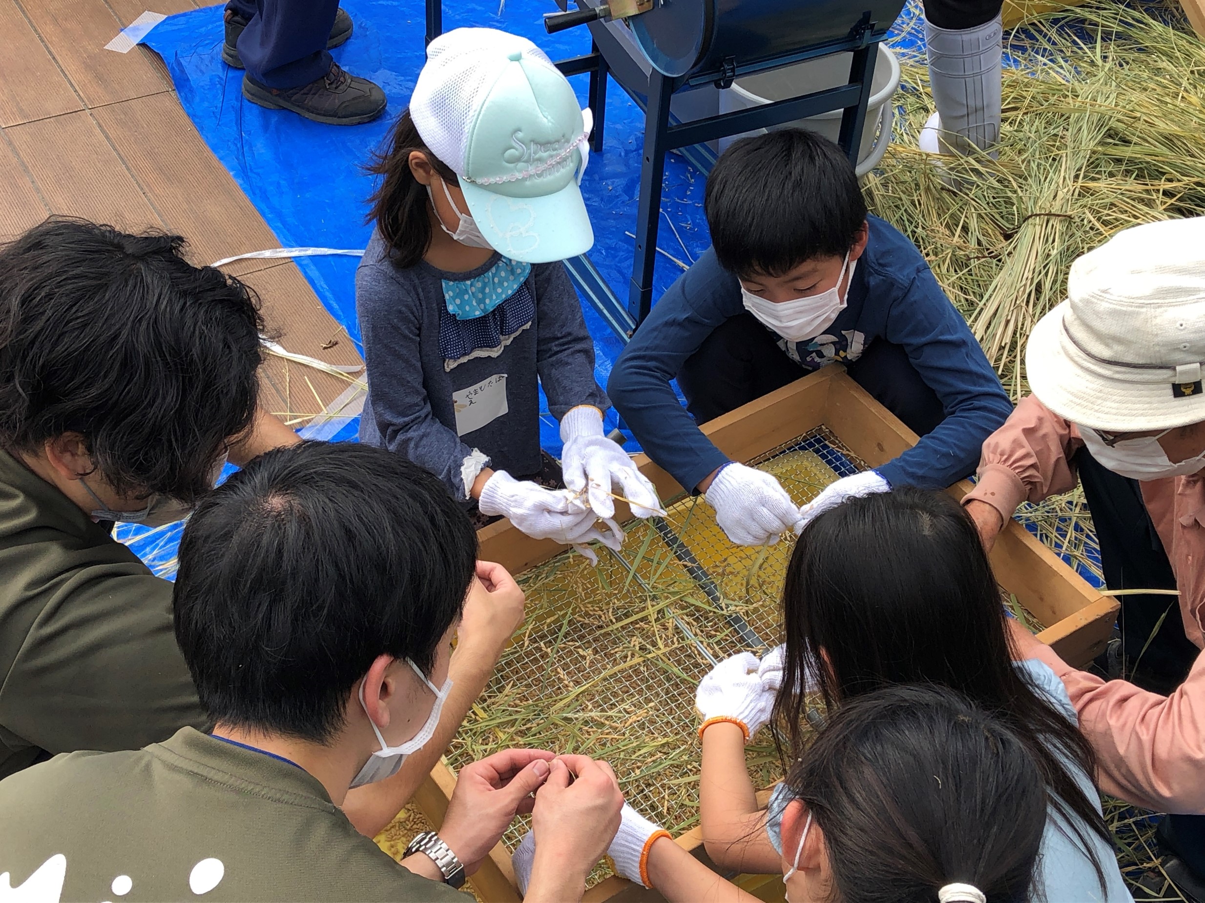 千歯こきや脱穀機で稲穂から外れなかった実は、無駄がないよう網の上で1粒1粒スタッフが籾殻仕分けの作業をします。すると、いつの間にか子どもたちも手伝ってくれていました。