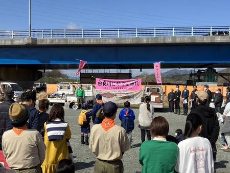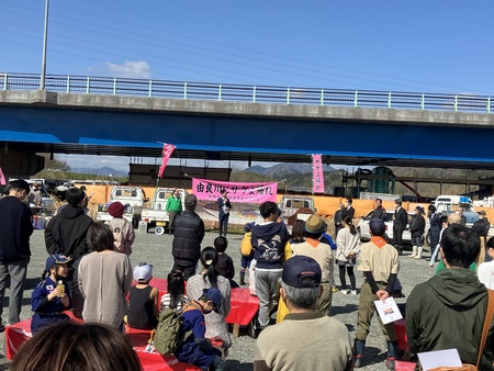 ついに放流日を迎えました。前日は雨が降っていましたが、この日はからっとした快晴です。放流会場の綾部市由良川花庭園付近に到着すると、すでにたくさんの地域の方々が集まっていました。