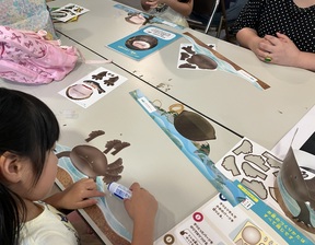 そんな幼生と成体の顔の違いを比べながら、台紙にパーツを貼って魚面を完成させていきました。
