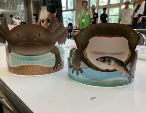 最後は、京都水族館のワークショップです。今回は、オオサンショウウオの幼生と成体の正面顔の魚面をつくります。