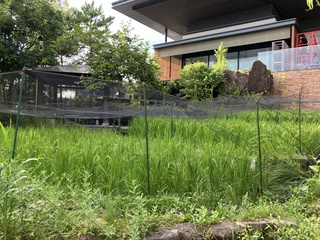 田植えを終え約3ヵ月、8月現在の田んぼではぐんぐんと稲が成長中!防鳥ネットを張り、実りの秋を迎えるまで、飼育スタッフが大切に育てます。