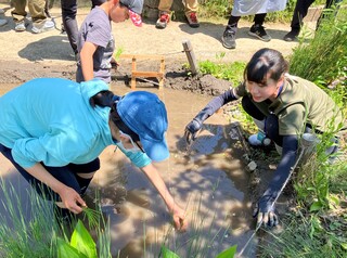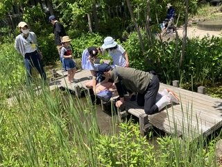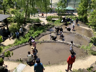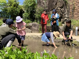 「京の里山」エリアには魚や昆虫、両生類などさまざまないきものが共生しています。田植えが終わってもまだまだ元気いっぱいな子どもたちは、飼育スタッフと一緒に池に網を入れていきもの探しを楽しみました。