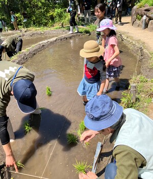 2024年5月11日(土)、田植え当日を迎えました。今年は、事前抽選に当選した年間パスポート会員9名のお子さまと一緒に田植えに挑戦です。