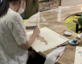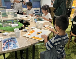 泳いでいる魚を観察しながら描くのは難しく、参加者の皆さんは最初こそなかなか筆が進まない様子でしたが、長嶋さんから直接アドバイスをもらい少しずつ画用紙に色をのせていき、個性あふれる素敵な作品ができあがりました。