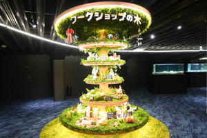 「ミテッテ」で最初に目に入るのがこの「ワークショップの木」。京都水族館が開館した2012年から、館内で体験いただいたさまざまなワークショップの代表的な工作品を展示しています。