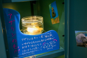 例えば、ひとつロッカーを開けてみると、アザラシの毛を展示中。年に一度の毛の生え変わり(換毛期)に集めたアザラシの毛です。普段はなかなか近くで見ることができないいきものにまつわるものや、飼育スタッフが普段拾い集めていたり身につけている愛用品まで、さまざまなアイテムを展示しています。ぜひロッカーを開けてお楽しみください。