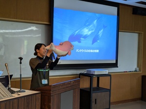 「ツムギ」は、いきもの広場開催日の2日後の9月30日に2歳の誕生日を迎えた子どものイルカです。解説では、ツムギの誕生の瞬間を撮影した動画をご覧いただきながら、イルカの出産や赤ちゃんの特徴についてお話しました。イルカは頭ではなく尾びれから生まれることや、生まれてすぐはお母さんが泳ぎをサポートするようすが動画からわかりました。