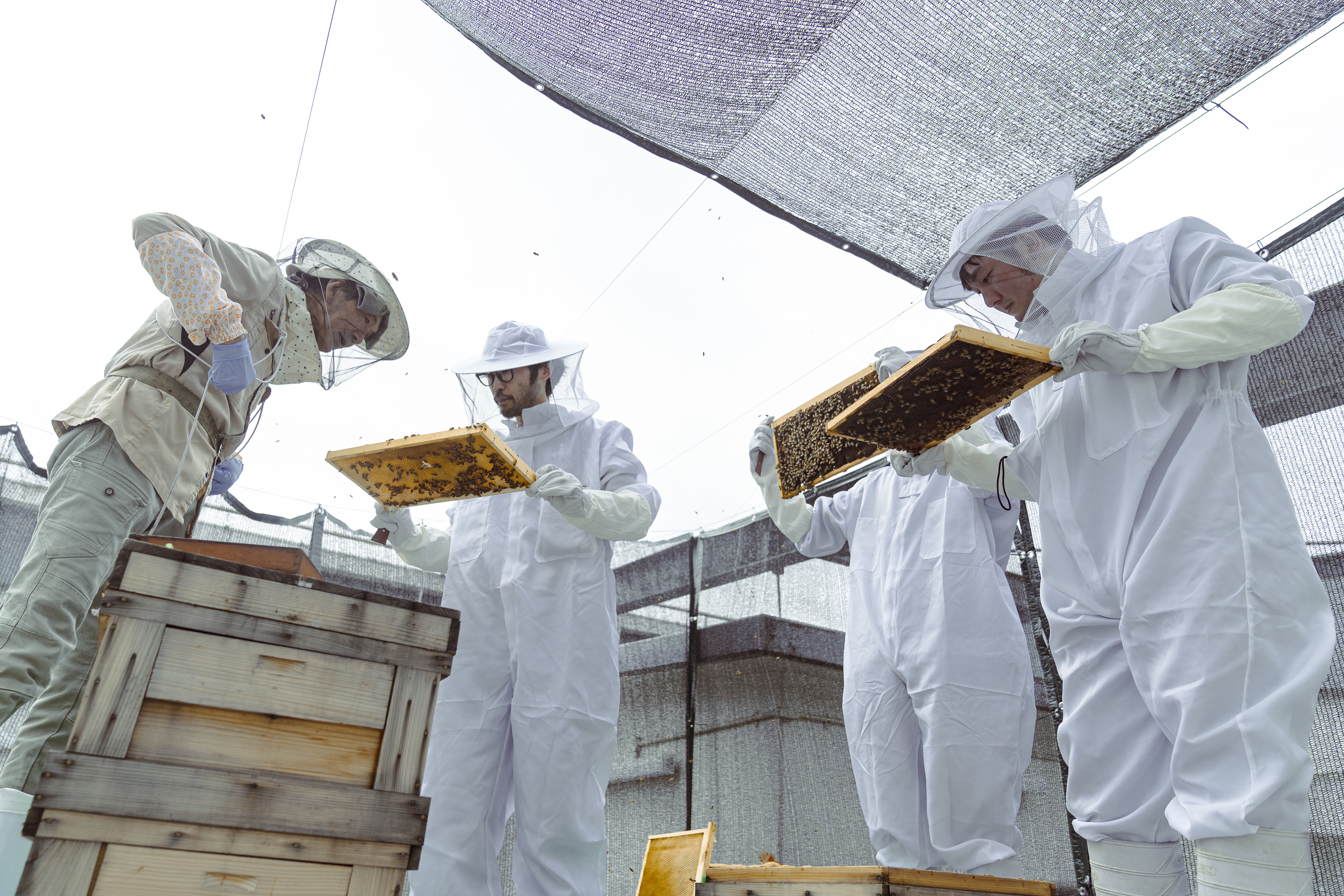 養蜂は全員はじめての経験なので、アドバイザーとして京都ヒグチ養蜂園の樋口義明さんにご指導いただき、4月に巣箱を設置して活動を開始。5月には、初めての採蜜を行いました。