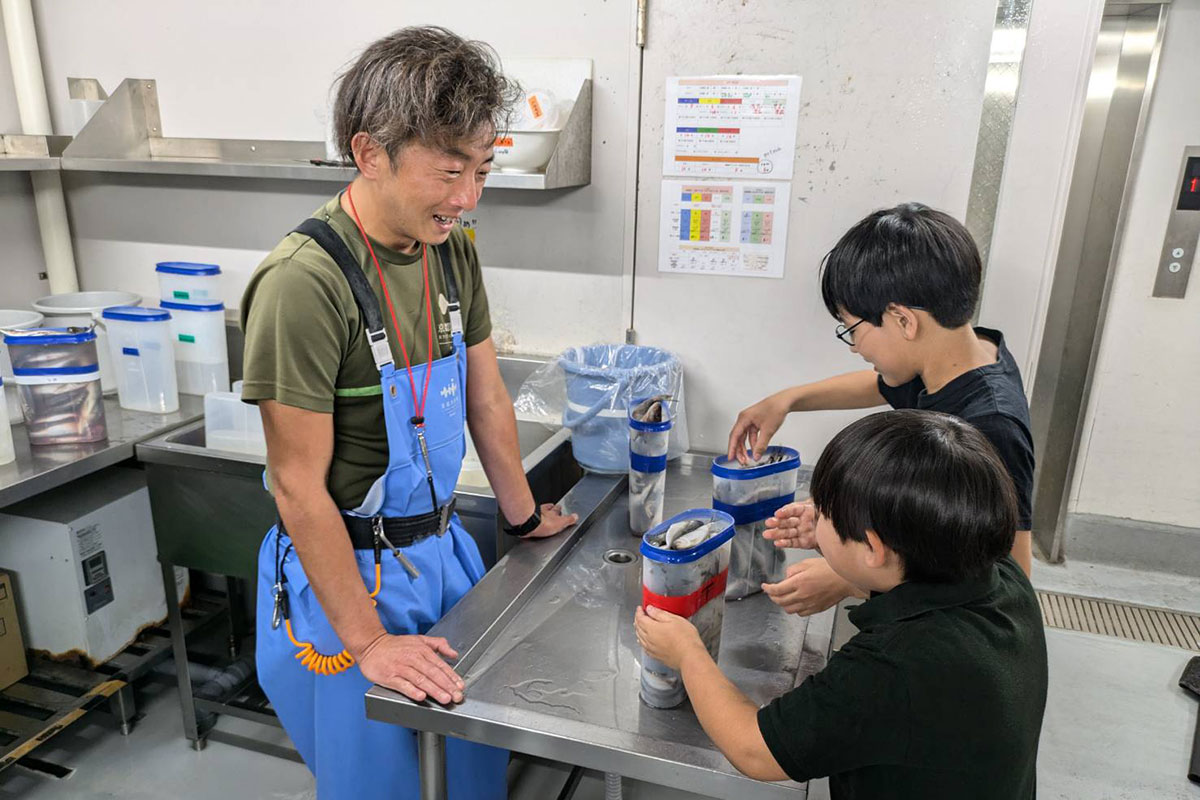 イルカが食べるごはんの準備作業をお手伝いいただきます。トレーナーは毎日どのようにイルカのごはんを準備するのか、実際に見て体験し、学ぶことができます。準備をお手伝いいただいたイルカのごはんは、授業プログラム「給食の時間」で使用します。