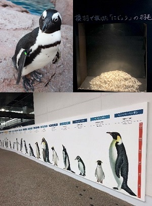展示しているペンギン:ケープペンギン展示の工夫:全18種の大きさが比較できるパネル展示、ケープペンギンの擬卵展示、換羽の際に一羽のペンギンから抜ける羽の総量の展示を行っています。