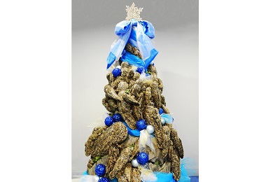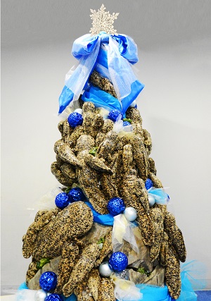 京都水族館では2013年から、京都の鴨川に生息するオオサンショウウオを身近に感じていただけるよう、ミュージアムショップで販売しているS(約20センチ)~LL(約90センチ)サイズのオオサンショウウオのぬいぐるみ約100体を使用し、クリスマスツリーの形に組み上げた「オオサンショウウオツリー」をクリスマスに合わせて展示しています。今年は、オオサンショウウオが生息する清流の情景を、岩肌やコケのほか、水の流れを青や白のリボン・オーナメントで表現しました。さらに、オオサンショウウオの本物の質感にこだわり、ぬいぐるみを特殊な塗料でコーティングし、オオサンショウウオの皮膚のテカリや濡れ感を再現しています。
