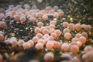 展示するイクラは、京都の北部を流れる由良川に産卵のため遡上したサケの卵を人の手で稚魚まで育て、再び由良川へ返す保護活動※を目的に採卵されたもので、「サケのふるさと由良川を守る会」からお預かりしています。京都水族館で約2カ月飼育・展示した後、3月上旬に成長した稚魚を由良川に放流します。