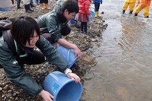 由良川で稚魚を放流するようす