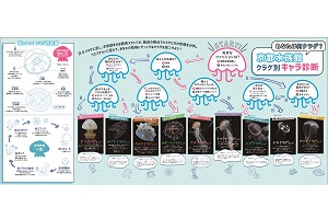 来館者の方にクラゲの多様性を学び、親しみを感じていただく取り組みとして、日々クラゲと向き合う飼育スタッフがそれぞれのクラゲの個性や特徴を分析し、独自の視点で作り上げた二つの大型パネル展示を開始します。質問に答えていくと、自分と同じタイプにあてはまるクラゲがわかる「クラゲ別キャラ診断」と、クラゲワンダーで展示を予定している24種※2の名前や特徴や飼育スタッフの想いを記した「クラゲワンダー大図鑑」を、各約4メートルの大型パネルで常設展示します。