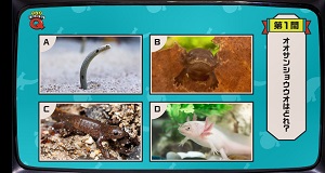 四択のクイズ形式で、楽しみながらオオサンショウウオについて学ぶことができます。大型のマルチモニター画面に流れる映像は、テレビのクイズ番組のような作りで、全六問にチャレンジしていただきます。オオサンショウウオの生態や特徴に加え、少しマニアックな問題も出題され、クイズとクイズの間には、コマーシャル風の動画も流れるこだわりの構成になっています。