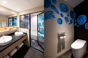 “滞在するホテル”と“展示する水族館”のそれぞれの特性を生かしたコンセプトルームは、オオサンショウウオをモチーフにした「OH! san View Room(オオサンビュールーム)」に続く2部屋目となります。2020年7月にオープンした京都水族館の新エリア「クラゲワンダー」誕生1周年を記念し、多様な形で揺らめくクラゲを独り占めしながら一晩過ごせる部屋があればとの思いから企画しました。夜空に浮かぶように客室の天井や壁、バスルームやトイレにまでゆらゆらふわふわ漂い、クラゲも客室で寛いでいるような圧巻の客室で、まるで海の底からクラゲを眺めているような気分でお過ごしいただけます。