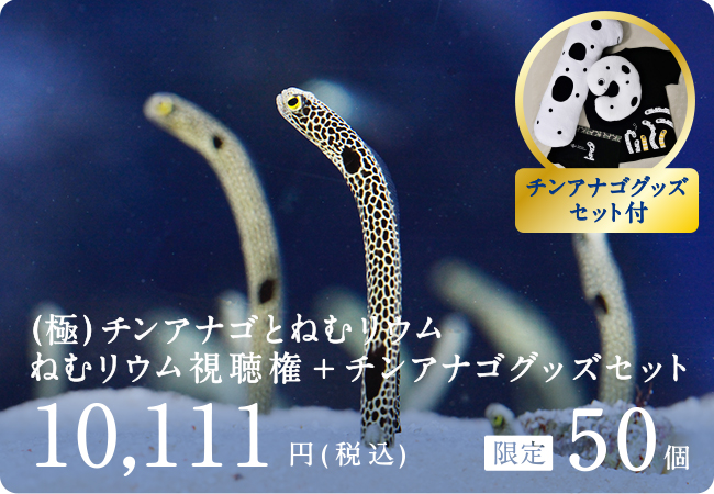 「ねむリウム」視聴権とチンアナゴのグッズがセットになった限定プランです。チンアナゴのイラストがプリントされたTシャツ、ボクサーパンツ※のほか、手触り感抜群の抱き枕とネックピローがセットになっており、チンアナゴに身を包みながら眠りへいざないます。