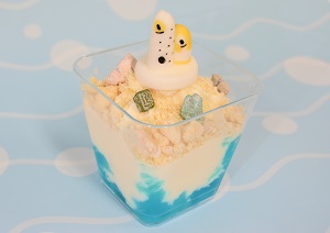 チンアナゴと、ニシキアナゴが巣穴からからだを出してゆらゆらしている姿を再現したスイーツメニューです。海をイメージした青いゼリーと甘いバニラソフトの上に、棲み処の砂に見立てたクッキーと、チンアナゴとニシキアナゴがひょっこり顔を出したようすを再現したマシュマロをトッピングしました。