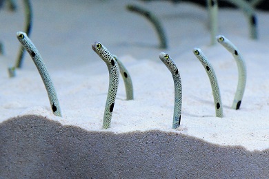 巣穴からからだを出し、ゆらゆらと動く姿が特徴的なチンアナゴについて、その生態の謎に迫る解説映像を約150インチの大型モニターで放映します。全身を砂から出して水中を泳ぐようすや、2匹で威嚇しあうようす、うんちをする瞬間など、貴重な映像をわかりやすい解説を交えて紹介します。