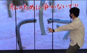 また、昨年に引き続き、チンアナゴの生態を解説する「教えて!チンチャンネル2021」を交流プラザの約150インチの大型モニターで放映します。チンアナゴのからだの仕組みや、全身を砂から出して泳ぐシーン、チンアナゴ同士で威嚇しあうシーンなど、貴重な姿をとらえた映像を解説と合わせてご覧いただけます。映像の最後には、フォトタイムを設定し、画面に映し出されたチンアナゴやニシキアナゴと同じ水中空間にいるような、とっておきの記念写真を撮影いただけます。