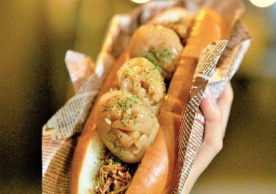 大のチリドッグです。ソーセージの代わりに、クラゲ形の味付けこんにゃくを挟み、チリソースをトッピングしました。優しい甘さのパンと、スパイシーなソース、和風味のクラゲこんにゃくが、意外にマッチする味と食感をお楽しみください。
