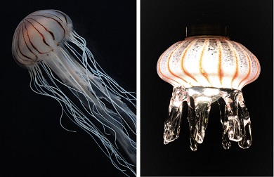 「クラゲワンダー」で展示する約30種※のクラゲの中から、20種のクラゲたちが、あたたかい光を放つランプシェードとなって「交流プラザ」の天井を彩ります。新潟のガラス専門店「TAKU GLASS」の職人技と、大きさ、色、形など種類ごとに特徴が異なるクラゲの魅力を伝えたいという飼育スタッフの想いが融合し、水族館ならではの美しい空間を演出します。