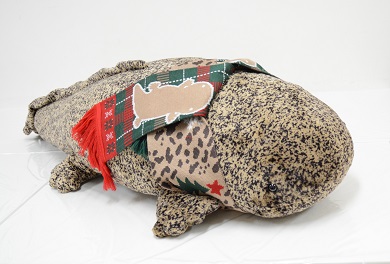 毎年異なるマフラーの色や柄で大人気の「マフラー付きオオサンショウウオぬいぐるみ」です。全長約130cmのオオサンショウウオぬいぐるみに、今年は赤と緑のクリスマスカラーを基調にオオサンショウウオのからだの模様をモチーフにした柄と、オオサンショウウオのイラストがデザインされたマフラーを巻きました。クリスマスのプレゼントとしても人気の数量限定商品です。マフラーは単品でもお求めいただけます。