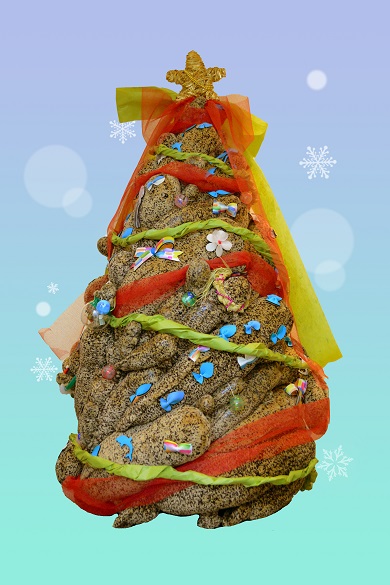 2013年より展示し、京都水族館の冬の風物詩にもなっている「オオサンショウウオクリスマスツリー」です。今年は「リサイクル」をテーマに、イベントなどで使用し、保管されていた大小さまざまなオオサンショウウオぬいぐるみ約70個を積み上げツリーの形にしました。装飾には古くなった飼育スタッフのウエットスーツをアレンジし、魚型やクラゲ型のオーナメントを作成しました。そのほか、廃棄予定だった飼育スタッフの長靴や水槽の水を循環するためのポンプに設置していた圧力計なども使用しています。アイデアから制作まで、スタッフのみで作り上げた高さ約2mのクリスマスツリーをお楽しみください。