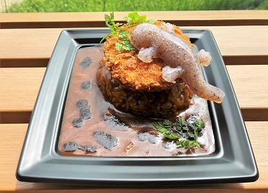 オオサンショウウオの形のこんにゃくを使用し、岩に見立てたハムカツを、オオサンショウウオがのっそりと登るようすを再現した、ピリ辛のカレーです。