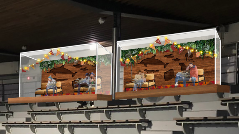 「グランピングドーム」は、フォークロア調のファブリックや装飾で飾られた空間に、「スペシャルシート」は、スタジアム最上段に2人掛けのソファを4組設置しました。どちらもビニールで囲われた空間で、中にはヒーターを設置することで、暖かい空間にしました。「スタジアムカフェ」で販売する温かなフードやドリンクを持ち込み、ゆったりとお過ごしいただけます。