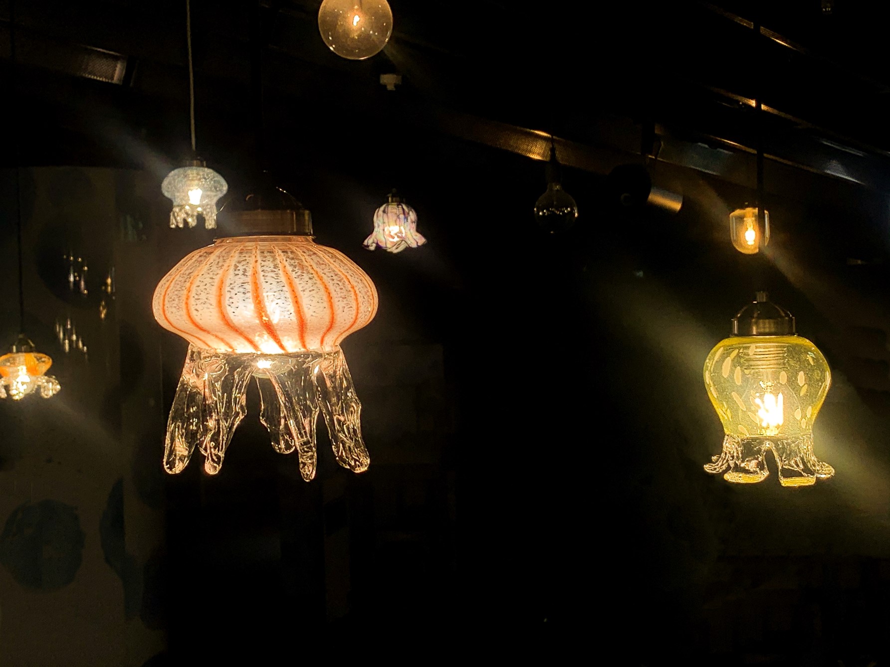 「クラゲワンダー」で飼育する約30種※のクラゲの中から、20種のクラゲが暖かい光を放つランプシェードとなって「交流プラザ」の天井を彩ります。新潟のガラス専門店「TAKU GLASS」の職人技と、大きさ、色、形など種類ごとに特徴が異なるクラゲの魅力を伝えたいという飼育スタッフの思いが融合し、京都水族館ならではのガラスの空間に仕上がりました。