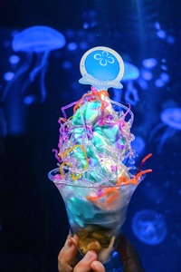 クラゲをモチーフにした暑い夏にぴったりのデザートメニュー。ラムネとバニラのミックスソフトクリームの上に、クラゲの触手に見立てたカラフルでコリコリとした食感の海藻麺をトッピングしました。