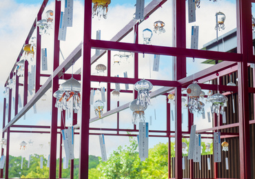 今年の展示エリアは、「2階テラス」と「ハーベストカフェ」に加え、「京の里山」エリア横に新設されたやぐらに展示します。お客さまより大変好評いただいているため、昨年の約150個からさらに展示数を増やし、過去最大規模の「くらげと風鈴」をお届けします。「京の里山」エリアの夏を感じる鮮やかな緑色の自然とともに、色とりどりの「クラゲ風鈴」をお楽しみいただけます。