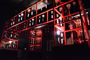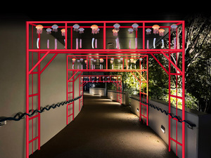 2階テラス、ハーベストカフェの展示エリアに加え、今年は「京の里山」エリア横のスロープにも展示エリアを増設し、過去最大規模での展示を行います。新展示エリアには、やぐらを設け、トンネルのような空間に45個の「クラゲ風鈴」を吊るします。昼間は「京の里山」エリアの夏の自然と「クラゲ風鈴」のコントラストを、夜には夏の夜風を感じながら響く風鈴の音色と、ライトアップされた「クラゲ風鈴」により幻想的な空間をお楽しみいただけます。