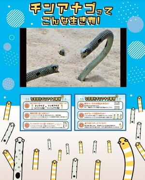 今年は、これまで当館の公式SNSに投稿したチンアナゴやニシキアナゴの動画の中から、反響の大きかった動画や、飼育スタッフが捉えた貴重な瞬間を特別編集版としてモニターで上映します。チンアナゴが巣穴を出て泳ぐようすや、ケンカをする姿など、水槽をじっくり観察していてもなかなか見ることのできない珍しいシーンをご覧になれます。あわせてチンアナゴとニシキアナゴの生態を、クイズ動画の放映や、パネルの展示で解説します。