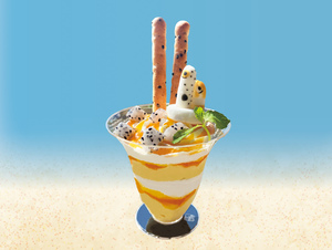 チンアナゴとニシキアナゴをモチーフにした見た目もかわいいマンゴープリンパフェが登場します。マンゴー味のプリンとソース、ホイップクリームでニシキアナゴの模様を表現しました。さらに、チンアナゴの黒い斑点を連想させるドラゴンフルーツと黒ごまビスケットをトッピング。寄り添うチンアナゴとニシキアナゴのかわいいマシュマロと一緒にお楽しみください。