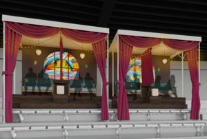 「イルカスタジアム」の最上段に温まりながらイルカを見ることができる2名掛けの「スペシャルシート」を4組設置します。ソファの壁面にイルカの親子をステンドグラス風に描いたレトロモダンな空間です。また、シートはビニールで囲まれており、ヒーターで温まりながらカフェメニューをお楽しみいただけます。