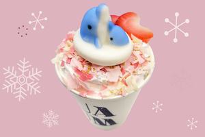 ハンドウイルカの親子・キアとツムギをイメージしたホットカフェラテが登場。カフェラテの上にホイップクリームを乗せ、ピンクのチョコレートとイチゴをトッピングしました。キアとツムギが寄り添うかわいいマシュマロがポイントです。ほろ苦いカフェラテとチョコレートが相性抜群な一杯です。