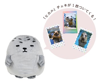 もちもちの手触りが人気のアザラシぬいぐるみに、数量限定で「ヒカル」のチェキ1枚がノベルティとしてついてきます。チェキは「ぷかぷかしているヒカル」「口をあんぐり開けているヒカル」など、岡本館長イチ押しの「ヒカル」の写真をセレクトした、世界に一つだけのオリジナルです。先着で1枚お選びいただけます。