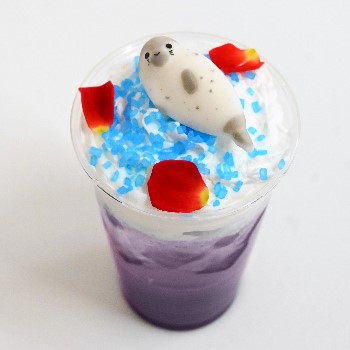 「ヒカル」がドリンクとなって登場。ブルーハワイにカシスリキッドを加えた、甘酸っぱくて爽やかなソーダドリンクです。ホイップの上に浮かぶマシュマロは、水槽から飼育スタッフやお客さまをジッと見ている「ヒカル」の姿をイメージしました。